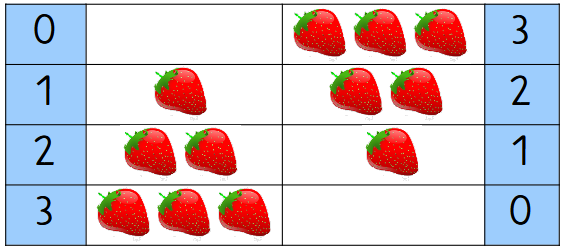Auch fällt dir auf, dass in jeder Reihe immer 3 Erdbeeren zu sehen sind, egal wie diese Erdbeeren aufgeteilt sind.