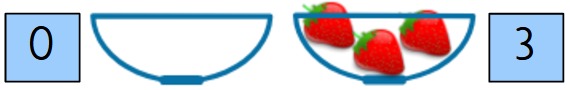 Wir teilen die Erdbeeren in zwei Glasschalen auf. Bei der ersten Möglichkeit erkennst du, dass in der linken Schale keine, also 0 Erdbeeren sind. Dafür sind in der rechten Schale 3 Erdbeeren.