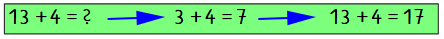 Hier zeige ich dir eine weitere Rechenstrategie, mit der du Additionen leichter rechnen kannst. Als Beispiel nehmen wir die Addition 13+4. Wenn du so etwas zum ersten Mal liest, bist du vielleicht ratlos und weißt nicht, wie du rechnen sollst. Dabei ist es sehr einfach. Statt mit der großen Zahl 13, rechnest du mit der kleinen Zahl 3. Und schon weißt du, wie du rechnen musst. Statt 13+4 rechnest du 3+4. Das Ergebnis ist 7. Jetzt gehst du zur ursprünglichen Aufgabe zurück und rechnest 13+4 = 17. Schaue dir das Beispiel im grünen Feld an.