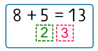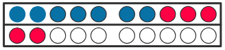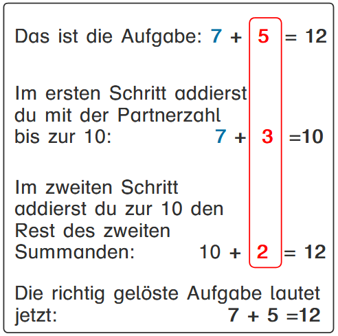 Und jetzt berechnest du das Ergebnis: Von der zweiten Pluszahl, der Zahl 5 hast du schon 3 rote Punkte addiert. Es bleiben noch 2 rote Punkte übrig, da 5-3 gleich 2 ist . Diese 2 addierst du zur 10. Dieser Rechenschritt lautet deshalb: 10+2=12.