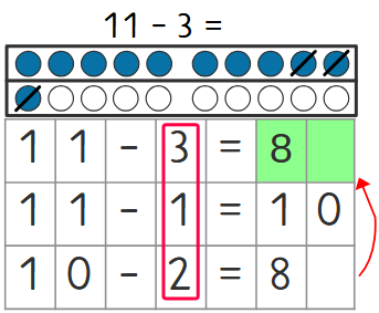 Bei den Plusaufgaben hast du gelernt, dass du beim Addieren zuerst bis zur Zehn rechnest. Hier bei diesen Subtraktionen rechnen wir ebenfalls zuerst bis zur 10. Bei den drei Beispielaufgaben verwenden wir auch das Zwanziger-Punktfeld.