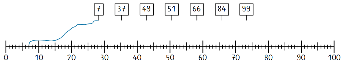 Von Strich zu Strich vergrößert sich eine Zahl immer um 1. Probiere das mal aus. Gehe zum Beispiel auf die Zahl 70 und zähle dann 10 Striche nach rechts weiter. Bis wohin bist du dann gekommen? - Richtig! Bis zur Zahl 80. Denn siebzig plus zehn ist achtzig (70+10=80).