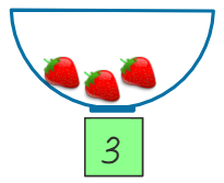 Hier siehst du die Glasschale mit 3 Erdbeeren. Im grünen Feld steht die Zahl 3 für die Anzahl der Erdbeeren.