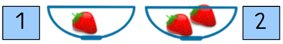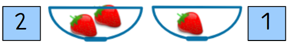 Bei der dritten Möglichkeit erkennst du, dass in der linken Schale 2 Erdbeeren liegen und in der rechten Schale eine Erdbeere liegt.