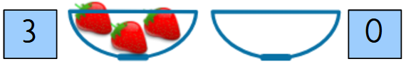 Wir teilen die Erdbeeren in zwei Glasschalen auf. Bei der ersten Möglichkeit erkennst du, dass in der linken Schale keine, also 0 Erdbeeren sind. Dafür sind in der rechten Schale 3 Erdbeeren.