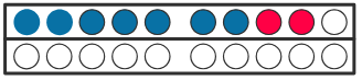 Im Punktfeld siehst du, dass du 7 blaue Punkte hast. Du bekommst 5 rote Punkte dazu. Zuerst werden von den 5 roten Punkten 3 genommen, um den oberen Punktstreifen bis zur Zahl 10 aufzufüllen. Es bleiben jetzt 2 rote Punkte übrig, denn 5-3=2. Diese 2 Punkte legst du in die nächste Reihe, in der du von 11 bis 20 zählen kannst.