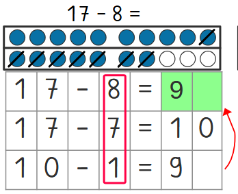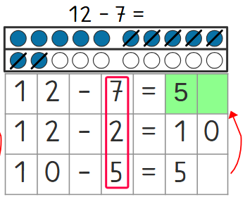 Bei den Plusaufgaben hast du gelernt, dass du beim Addieren zuerst bis zur Zehn rechnest. Hier bei diesen Subtraktionen rechnen wir ebenfalls zuerst bis zur 10. Bei den drei Beispielaufgaben verwenden wir auch das Zwanziger-Punktfeld.