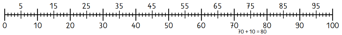 Von Strich zu Strich vergrößert sich eine Zahl immer um 1. Probiere das mal aus. Gehe zum Beispiel auf die Zahl 70 und zähle dann 10 Striche nach rechts weiter. Bis wohin bist du dann gekommen? - Richtig! Bis zur Zahl 80. Denn siebzig plus zehn ist achtzig (70+10=80).