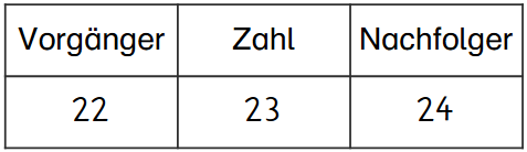 In der kleinen Tabelle siehst du die Zahl 23 mit ihren beiden Nachbarzahlen. Die Zahl 22 ist die Vorgängerzahl und die Zahl 24 ist die Nachfolgezahl.