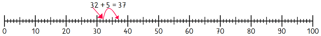 Wir beginnen mit der Beispielaufgabe 32+5. Am Zahlenstrahl sieht das so aus: